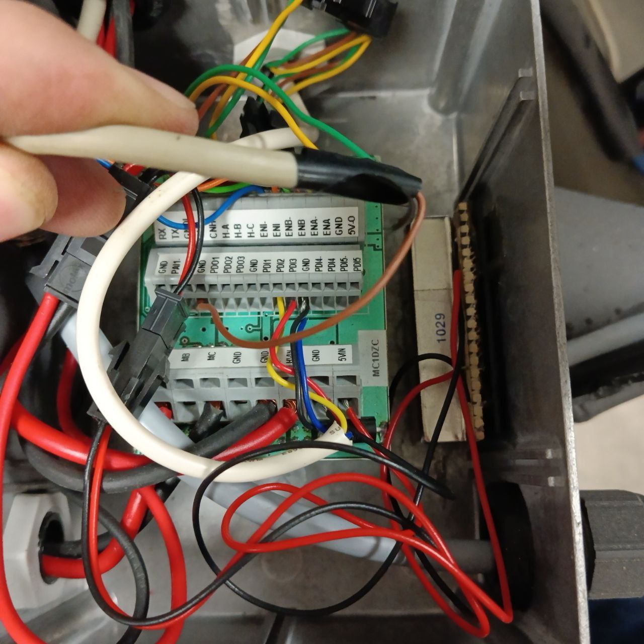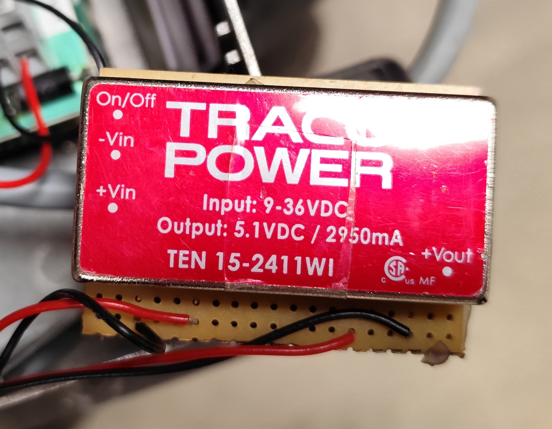Este controlador también necesita un convertidor DC-DC para ser alimentado a 5V, este está alimentado a los 24V que entran en la caja y está conectado a la entrada 5IN y GND.