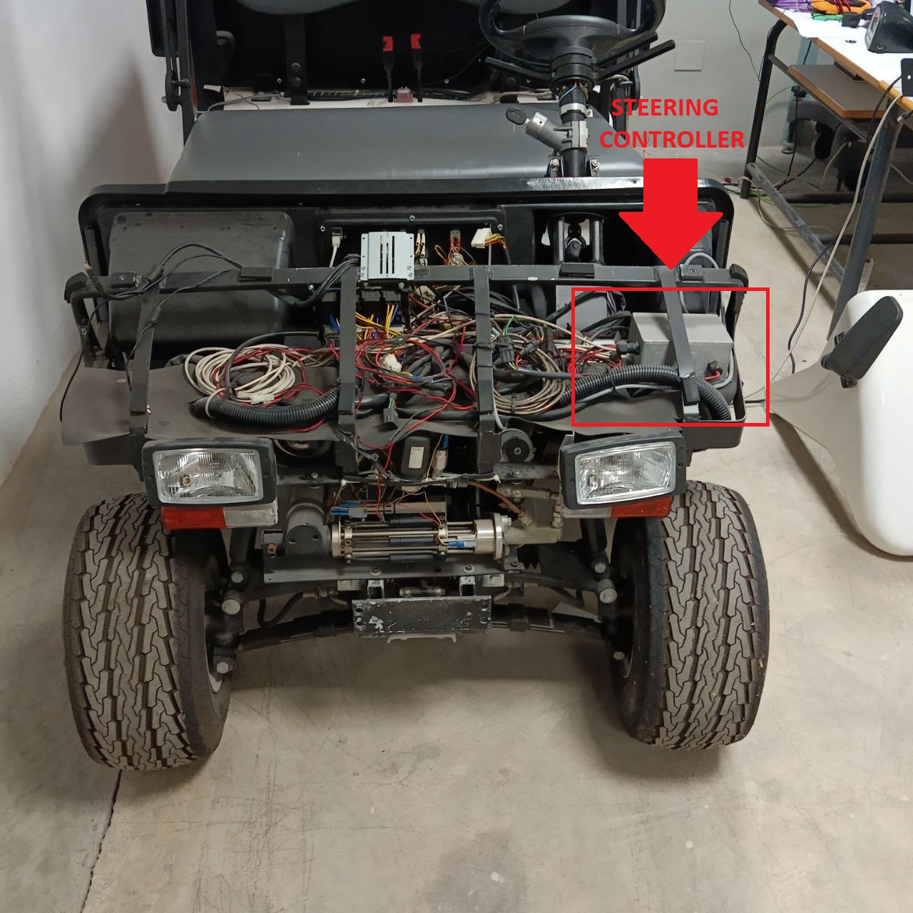 La electrónica del sistema de dirección está ubicado en la parte frontal del vehículo. Como podemos observar, se encuentra dentro de la caja metálica indicada en la imagen.